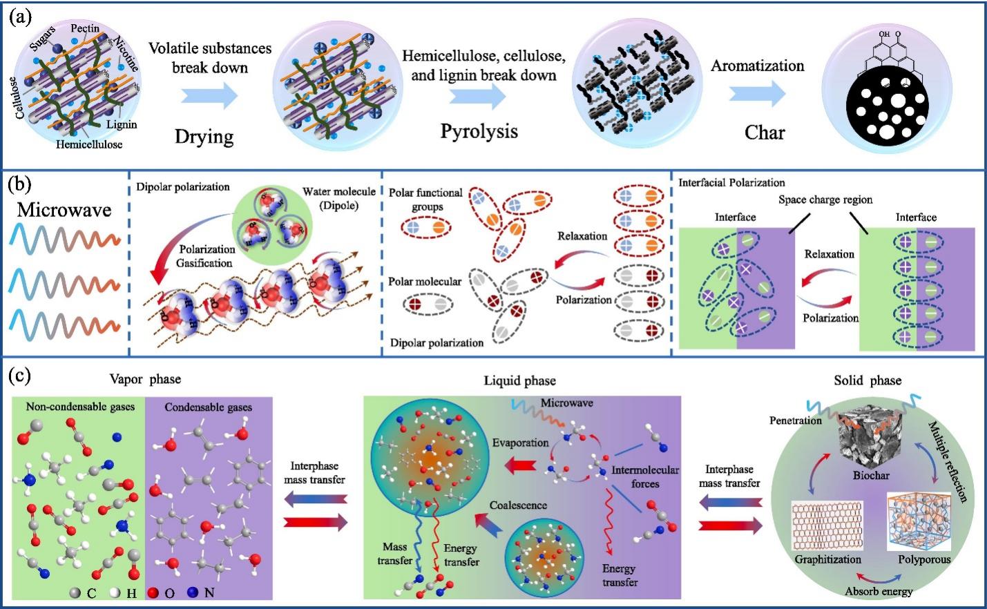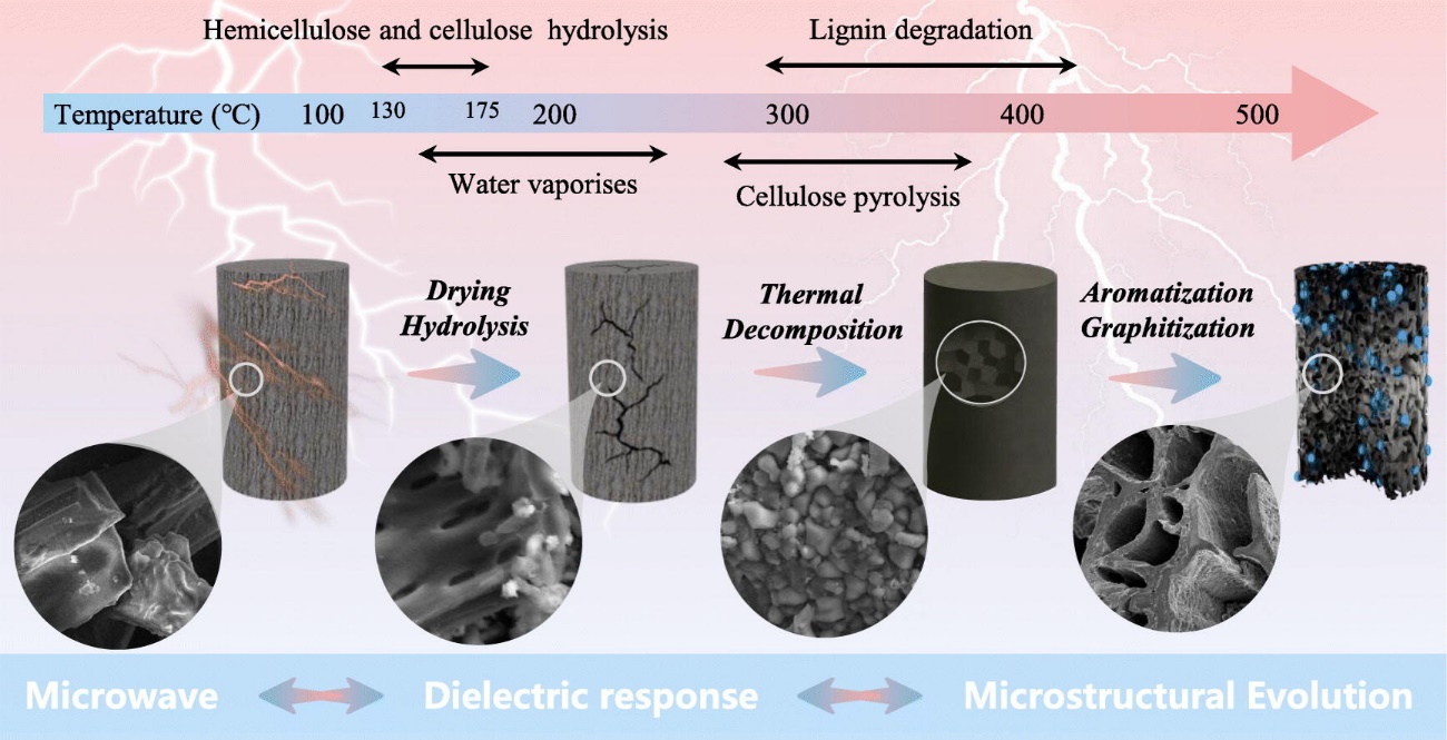 近期,云南师范大学能源与环境科学学院资文华教授团队在国际知名期刊《Chemical Engineering Journal》(IF = 13.2)发表题为“Dielectric response and pyrolysis mechanisms during biomass microwave pyrolysis: Intrinsic coupling among heat/mass transfer, microstructural evolution, and microwave energy conversion”最新研究成果。论文链接:https://doi.org/10.1016/j.cej.2025.171890,云南师范大学为第一完成单位,通讯作者为资文华教授。该成果以烟草废弃烟梗为对象,系统阐释了烟梗微波热解关键参数对生物炭微观结构影响规律,通过2D-FTIR-COS技术阐明生物炭表面官能团响应顺序为: O–H→C=O→C–O–C→C–H→芳香C=C,并利用THz‑TDS光谱和 Debye弛豫模型对产物微波介电参数预测,发现物料初始含水量为 20%时可显著提升微波吸收和加热性能,揭示了生物质微波热解介电响应机制主要依赖偶极极化、离子极化及界面极化的协同响应,这为介电参数表征和生物质微波热解提供了新视角。
