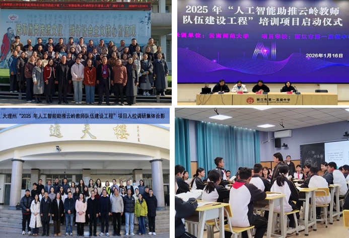1月16日至17日,由我校信息学院承担的云南省2025年“人工智能助推云岭教师队伍建设工程”(第四区域)项目在大理州、丽江市、德宏州三地,下关第一中学(初中部)、大理州实验小学、丽江市第一高级中学、盈江县第一初级中学和芒市第四小学五所学校同步举行启动仪式。三地教育体育局代表、项目学校教师及项目管理团队共计250余人参加活动。