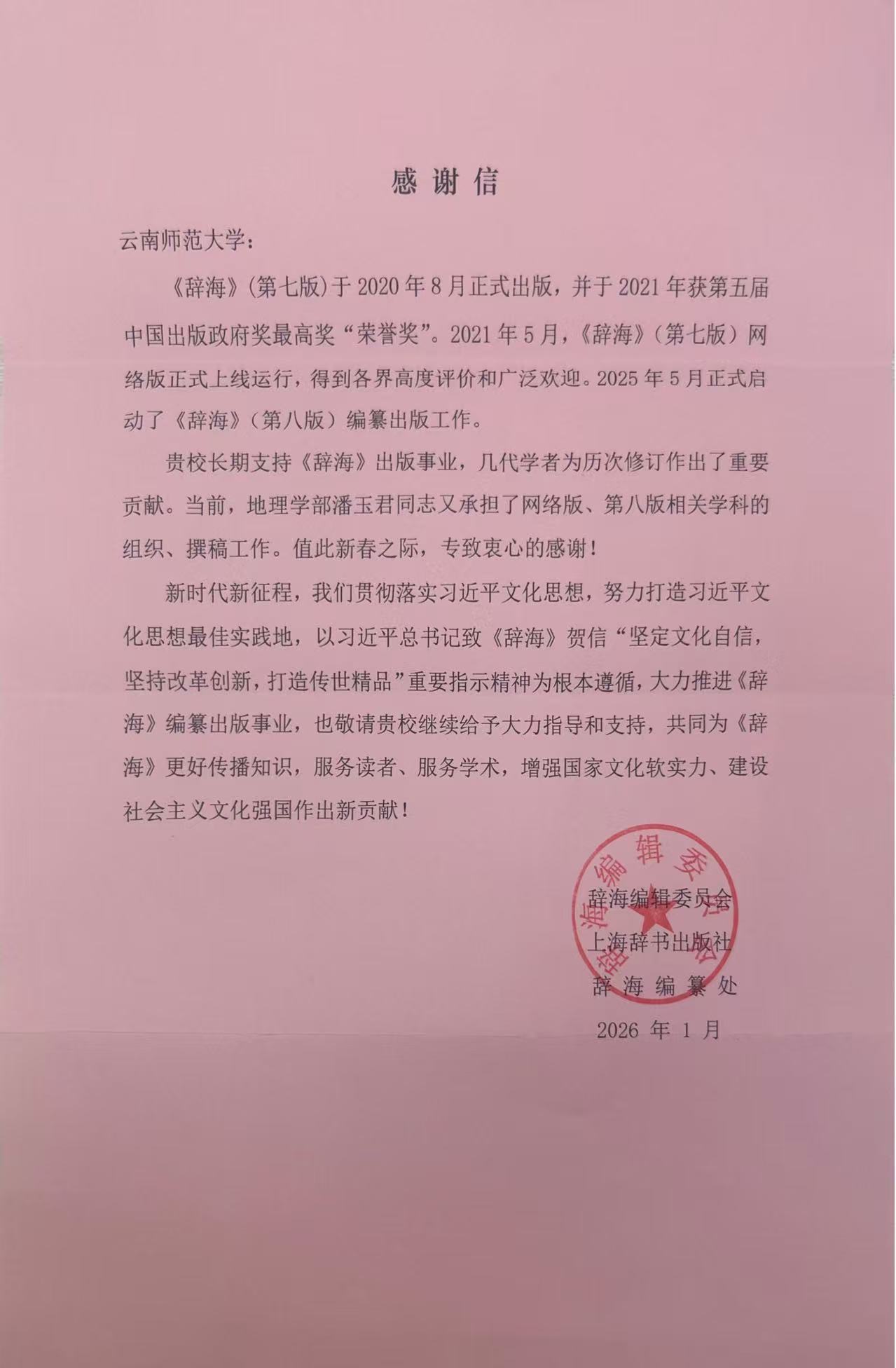 近日,辞海编辑委员会致信我校地理学部潘玉君教授,对其在《辞海》(第七版)网络版及第八版编纂工作中承担的学科组织与撰稿任务表示认可与感谢。