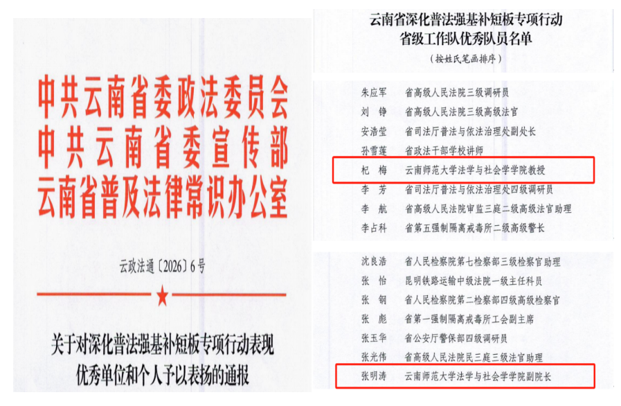 法学与社会学学院杞梅教授、张明涛副教授获评云南省深化普法强基补短板专项行动省级工作队优秀队员。