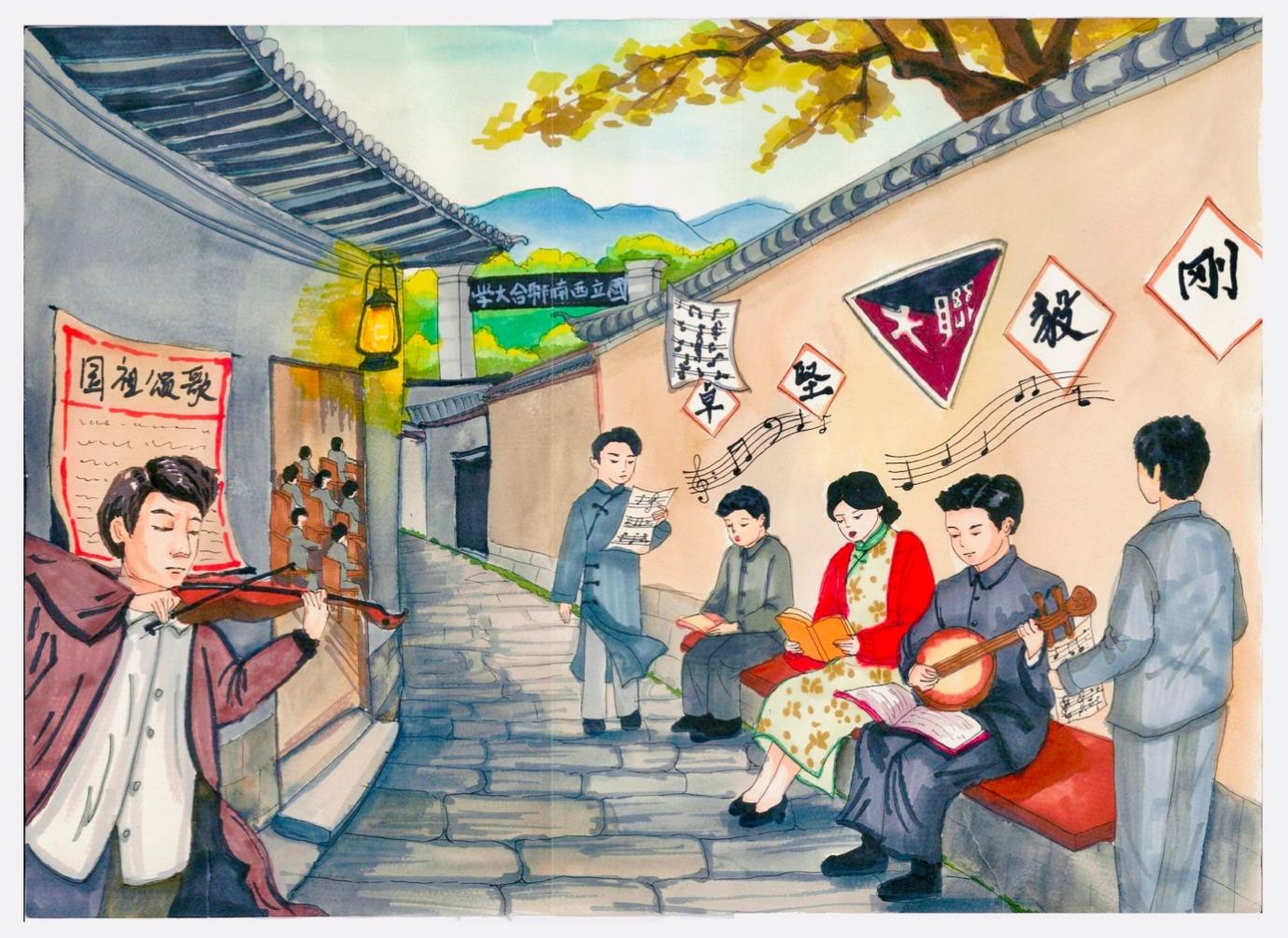 此次展览以“童画联大”为主题,孩子们用色彩与线条勾勒眼中的西南联大,将对联大历史的理解、联大精神的感悟融入作品,让厚重的联大历史以鲜活的方式走进社区。行走其间,一步一景、满是情怀。