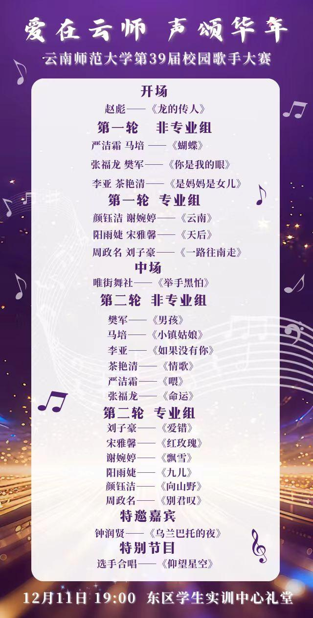 从初试锋芒的百人竞技,到复赛舞台的精彩过招,再到半决赛的强强对话,“爱在云师·声颂华年”校园歌手大赛终于迎来最终章。这不仅是声线的较量,更是青春故事与音乐梦想的交汇。每一个音符里,藏着云师人的朝夕;每一段旋律中,回荡着这个年纪独有的热烈与真挚。