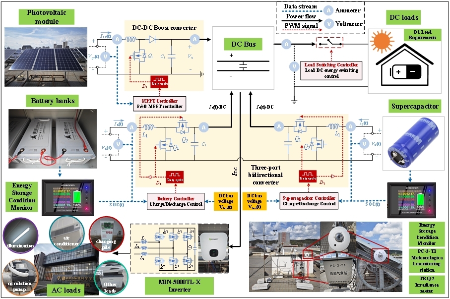 面对光伏功率受太阳辐照影响产生波动、传统算法难以平衡储能相关指标的问题,该团队提出用于混合储能系统容量配置的低通滤波算法,并且设计450W三端口直流变换器实现混合储能系统控制。结果表明,该算法可将混合储能容量降低2.65%-78%,20kW光伏系统全年波动率降低0.07%-64.53%。成果以“Optimal power allocation and capacity configuration based on variable cut-off frequency low-pass filtering for photovoltaic with hybrid energy storage system”为题,于2026年1月1日发表在Renewable Energy期刊(中科院一区,IF=9.1),硕士研究生阚小博为第一作者,马逊教授为通讯作者。