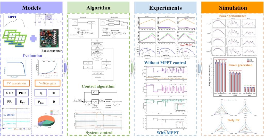 针对光伏组件长期运行后性能非均匀衰减导致的电特性失配痛点,该团队设计改进型二次型升压变换器并研制550W组件级样机。实验表明,该变换器可使失配组件在不同辐照条件下日发电量提升0.40%-9.59%。相关成果以“Topology Design of Quadratic Boost Converter for Nonuniformly Aged Photovoltaic Modules Mismatch Mitigation”为题,2026年2月5日在线发表于Solar Energy期刊(中科院二区,IF=6.6),硕士研究生高丰、张国超为论文共同第一作者,马逊教授为通讯作者。