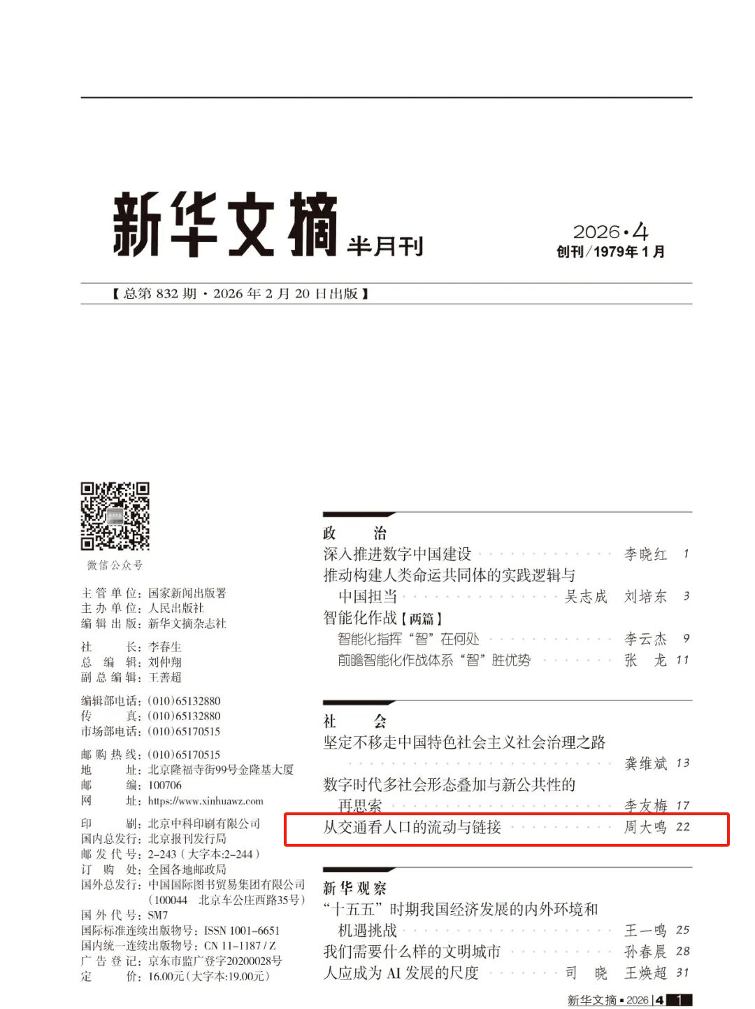 近日,我校周大鸣教授文章《从交通看人口的流动与链接》(原刊登于《探索与争鸣》2025年第10期)被《新华文摘》2026年第4期全文转载。
