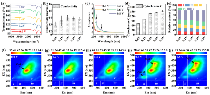 研究发现在组分层面,BV促使EPS的组成向蛋白质主导转变。在分子层面,BV有效调控EPS中蛋白质的二级结构,诱导EPS中蛋白质的二级结构中可充当高效电子“中继站”的β-转角含量增加。定量分析进一步证实,BV有效富集了EPS中的电活性组分,包括细胞色素c和腐殖酸类物质。代谢组学分析揭示了BV对EPS中氧化还原介质体系的调控作用。BV诱导EPS中醌类和含吲哚基团的化合物显著上调,促使形成以吲哚和醌类化合物为特征的氧化还原活性环境。这些代谢物作为电子穿梭体或辅因子,以游离态或结合态在长程电子传递中发挥关键作用。