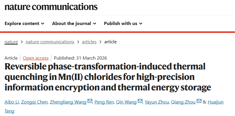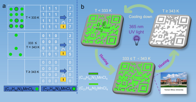 近日,云南师范大学化学化工学院王琴课题组与云南民族大学研究团队开展深度合作,在国际顶尖学术期刊《自然·通讯》(Nature Communications)发表题为“Reversible phase-transformation-induced thermal quenching in Mn(II) chlorides for high-precision information encryption and thermal energy storage”的最新研究成果。Nature Communications是国际权威期刊Nature集团旗下的重要子刊,最新影响因子为15.7,位列中国科学院期刊分区综合性期刊1区Top行列。该论文第一作者李爱波为云南师范大学化学化工学院2023届制药工程专业毕业生,目前在云南民族大学攻读硕士学位,王琴担任通讯作者。