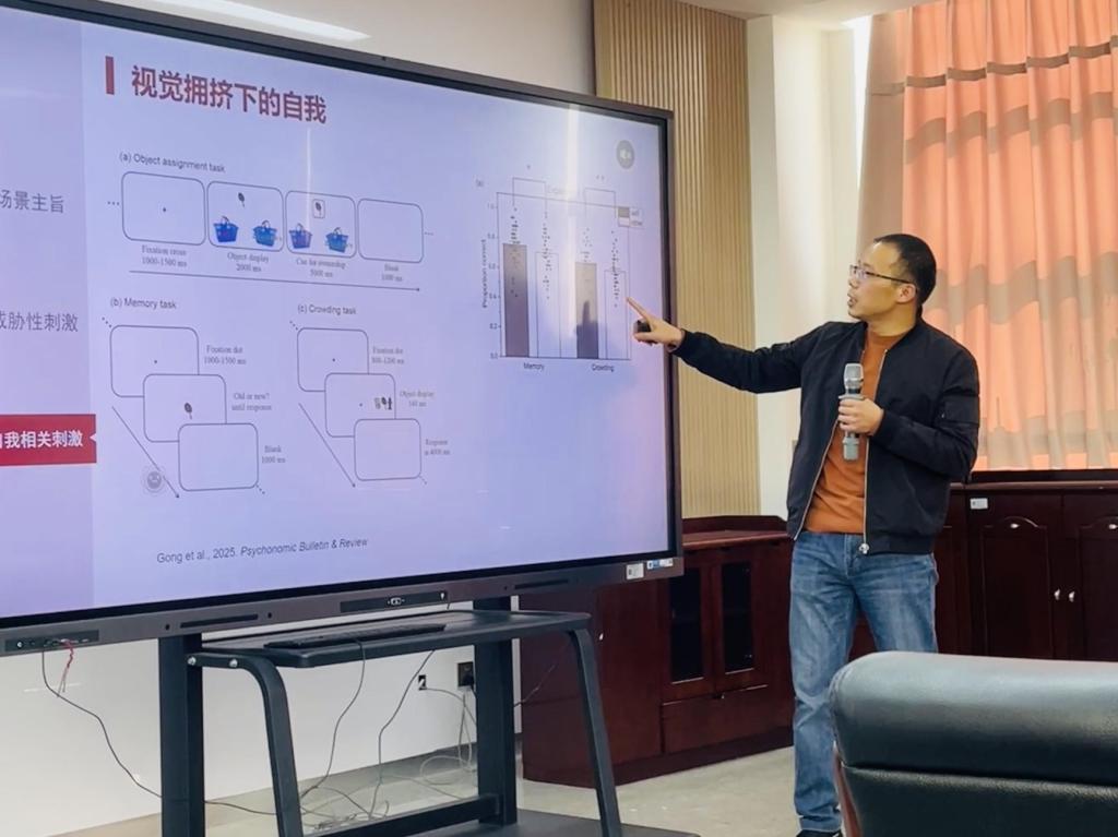 龚明亮以“高水平视觉拥挤的认知特点与神经机制”为题作学术报告。他指出,高水平视觉信息同样会产生视觉拥挤效应,且其加工模式与低水平视觉信息存在本质差异。这表明视觉拥挤不仅涉及早期视觉皮层,也与额叶等高级皮层的认知加工密切相关。