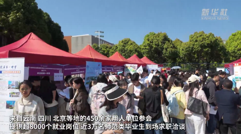 3月26日,云南省2026年大规模师范类毕业生招聘会在云南师范大学呈贡校区举办。来自云南、四川、北京等地的450余家用人单位参会,提供超8000个就业岗位,近3万名师范类毕业生到场求职洽谈。