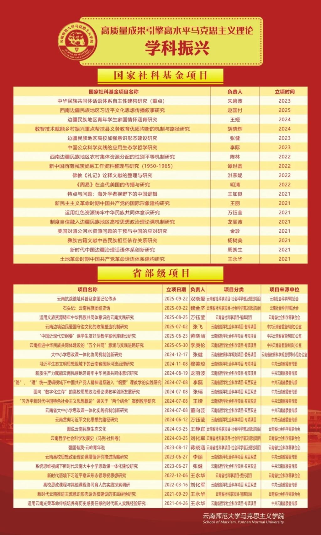 持续深化党史党建、地方党史等相关领域研究,逐步构建起“主干引领、多元互济”的学科布局,推动学科深度融合,营造协同共进的学科生态,显著增强学术核心竞争力和思想引领力。举办教育部高校思政课教指委“马克思主义基本原理”分教指委工作年会、大中小学思政课一体化建设教学研讨会等高水平学术会议11场。打造“博思论坛”“青马论坛”“湖畔学术沙龙”等系列化学术品牌,强化学科专业建设支撑。加强有组织科研,学科核心竞争力持续提升。新增教育部平台2个、省级哲社创新团队1个,成立铸牢中华民族共同体意识教育研究院。获批省级以上科研项目68项,包括国家社科基金重点项目1项、面上项目18项、教育部项目6项、省级项目43项。在《马克思主义与现实》等刊物上发表高质量学术论文80篇,在人民出版社等出版专著27部,其中B类15部;获省哲社科研成果奖3项。积极实施马克思主义理论学科振兴行动计划,推进马克思主义理论一级学科博士学位授权点培育建设与申报工作。