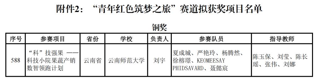 近日,2025中国国际大学生创新大赛获奖名单公布,我校申报的“‘科技强果’——科技小院果蔬产销数智领跑计划”项目,在“青年红色筑梦之旅”赛道获国家铜奖。该项目由陈玉保、刘莹、陈长瑶、张伟、刘娜等教师团队指导,夏成城、严艳玲、杨腾然、徐榕璟、KEOMEESAYPHIDSAVARD(老挝籍博士生)、聂懿宸等能环学院与经济学院学生联合组建团队,依托多学科优势,聚焦高原湖泊生态保护与农业现代化协同发展,为高原湖泊区农业绿色转型提供可复制的示范样本。