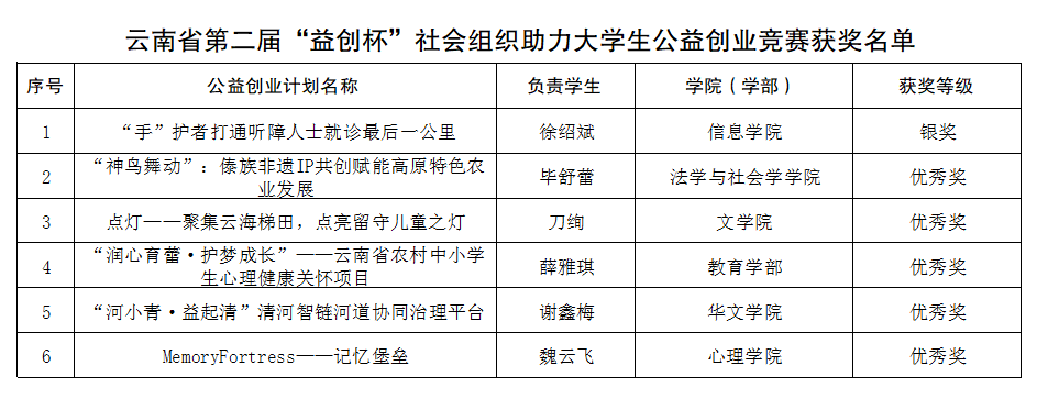 12月18日,第二届“益创杯”社会组织助力大学生公益创业竞赛顺利落幕。竞赛由云南省民政厅主办,云南省社会组织促进会承办,云南连心社区照顾服务中心联合承办。我校学子在比赛中表现突出,获银奖1项、优秀奖5项,学校获评“最佳组织奖”。