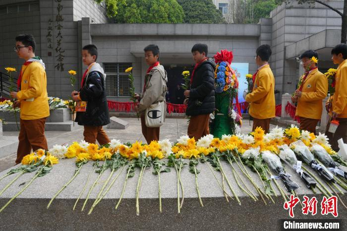 4月3日,云南昆明,学生排队向烈士敬献鲜花。当日,社会各界人士齐聚云南师范大学,在西南联大旧址的 "一二·一" 四烈士墓前,举行 "清明祭英烈" 活动,共同追思为民族独立、人民解放而献出生命的烈士们。中新社记者 刘冉阳 摄
