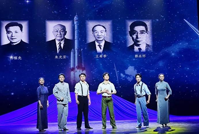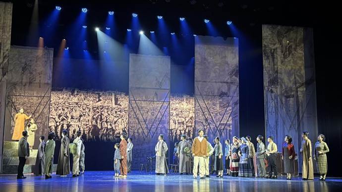 前三章专注还原历史,第四章则有更多创作空间。“我们一直在修改第四章节,和2023年首次公演相比,基本上重写重排。”沈建鑫告诉半月谈记者,最初第四章节以集体朗诵、跳舞的形式呈现群像风采,场面盛大恢弘。如今,从杰出人物的事迹、心理入手,以点带面,既表现他们忠心报国的精神,也刻画其内心的纠结、对家人的不舍。
