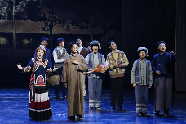 序章《联大丰碑》以西南联大纪念碑为引,带领现场师生跨越时空,回顾西南联大波澜壮阔、动人心弦的历史。《薪火南迁》篇章中,西南联大学子紧握拳头激昂呐喊,挥舞旗帜。风雨泥泞,湘黔滇旅行团师生背着行囊,相互搀扶,跨越山海、守护文脉。